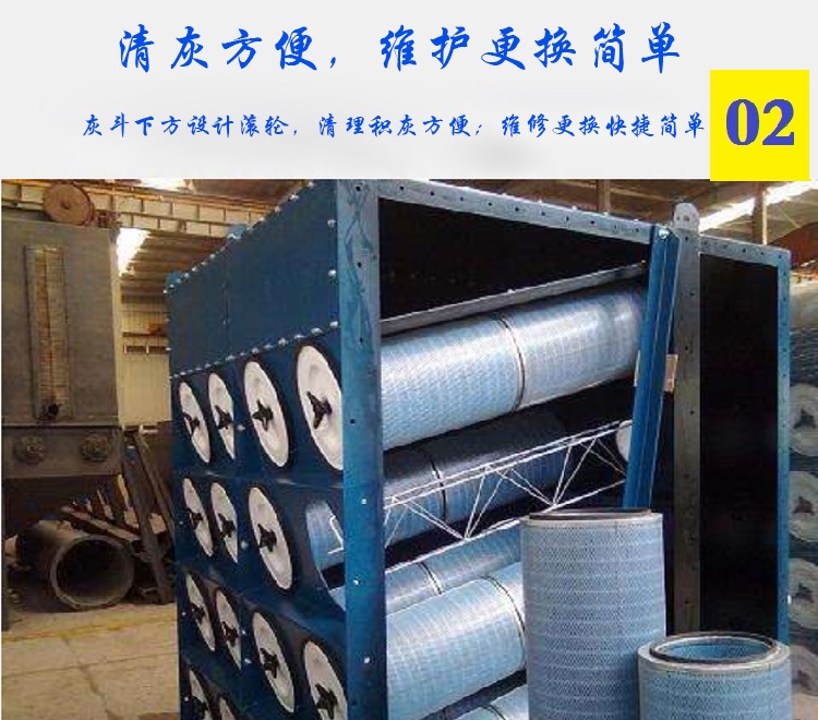而較細(xì)粉塵均勻地進(jìn)入中部箱體而吸附在濾筒的外表面上,干凈氣體透過濾筒進(jìn)入上箱體,并經(jīng)各離線閥和排風(fēng)管